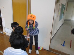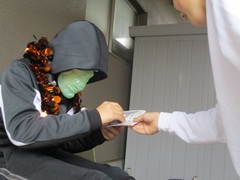 校内の10名のおばけ(仮装した総務委員と先生たち)を探し、「トリックオアトリート!」と声をかけてスタンプを集めます。全部集めたらお楽しみプレゼントという企画でした。