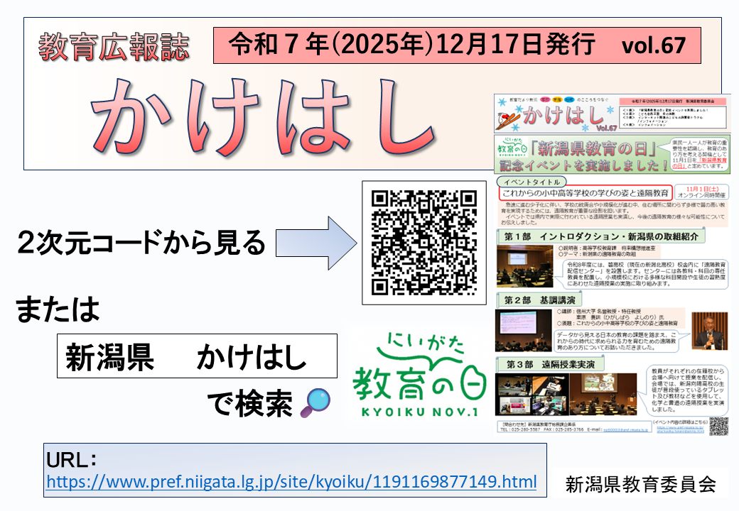 教育広報誌「かけはし」67号です。下の掲載ページ2次元コード案内をクリックし、2次元コードか下記URLからご覧ください。https://www.pref.niigata.lg.jp/site/kyoiku/1191169877149.html